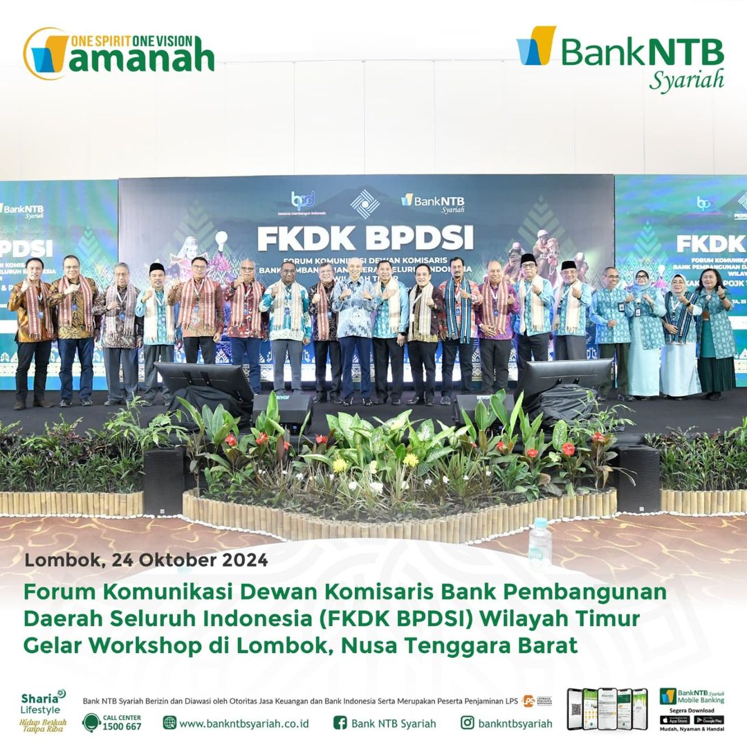 Lombokfile.com -Bank NTB Syariah sukses menjadi tuan rumah penyelenggaran Workshop Forum Komunikasi Dewan Komisaris Bank Pembangunan Seluruh Indonesia (FKDK BPDSI) Wilayah Timur. Membahas terkait POJK Nomor 17 Tahun 2023 dan POJK Nomor 5 Tahun 2024, kegiatan ini berlangsung pada 23 s.d. 26 Oktober 2024 bertempat di Merumatta Senggigi Hotel. Workshop FKDK BPDSI Wilayah Timur dihadiri oleh Dewan Komisaris BPD di Wilayah Timur diantaranya, Bank NTB Syariah, Bank SulutGo, Bank Sultra, Bank Sulteng, Bank Sulselbar, Bank Bali, Bank Maluku Malut, Bank Papua, serta turut hadir dalam kegiatan ini Bank Riau Kepri Syariah.