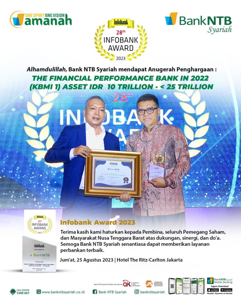 Lombokfile.com – Bank NTB Syariah berhasil meraih anugerah penghargaan The Financial Performance Bank in 2022 (KBMI 1) Asset IDR 10 Trillion -< 25 Trillion pada 28th Infobank Award 2023 di The Ritz-Carlton, Mega Kuningan, Jakarta, Jumat, 25 Agustus 2023.