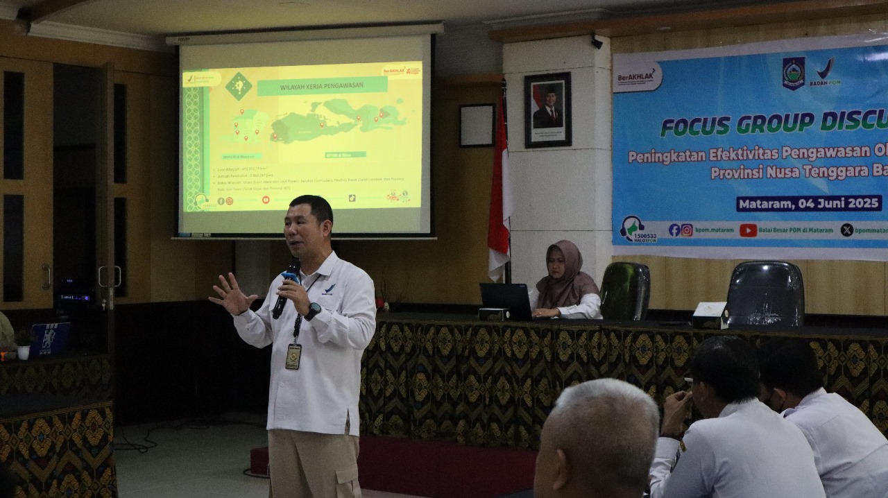 Lombokfile.com -Guna mendukung peran aktif Kementerian (Lembaga dan Pemda Provinsi / Kabupaten / Kota) telah diterbitkan Inpres No 1 Tahun 2017 Tentang Peningkatan Efektifitas Pengawasan Obat dan Makanan dan Permendagri No 41 Tahun 2018 Peningkatan Koordinasi Pembinaan dan Pengawasan Obat dan Makanan di Daerah. Salah satu poin pentingnya adalah pembentukan Tim Koordinasi Pembinaan dan Pengawasan Obat dan Makanan di Daerah atau TKPPOM. Dalam rangka monev efektivitas TKPPOM Tingkat Provinsi, pada tanggal 4 Juni 2025 BBPOM di Mataram menyelenggarakan Focus Group Disscusion (FGD) Peningkatan Efektivitas Pengawasan Obat dan Makanan. Kegiatan dihadiri oleh Asisten 1 Setda Provinsi NTB Bidang Pemerintahan dan Kesra Fathurrahman dan OPD tingkat Provinsi, antara lain: Dinas Kesehatan, Dinas Perindustrian, Dinas Perdagangan, Dinas Pertanian, Dinas Koperasi dan UMKM, Bappeda, Diskominfotik, Diskanlut, Kanwil Kemenag, dan lain-lain.