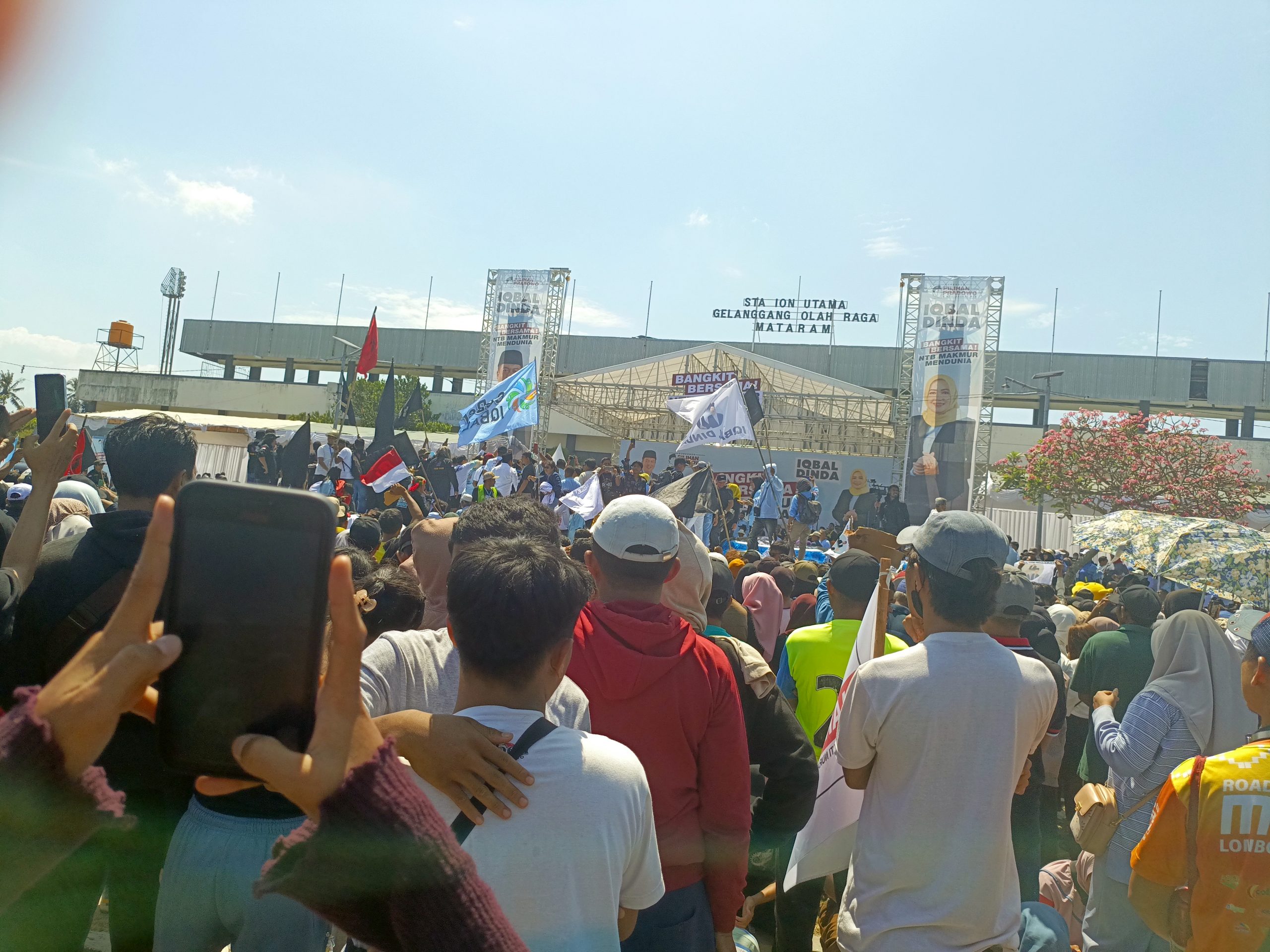 Sebelum deklarasi dimulai, kedatangan rombongan Lalu Iqbal disambut meriah oleh masyarakat yang tengah berkumpul di sepanjang jalan GOR Turida.