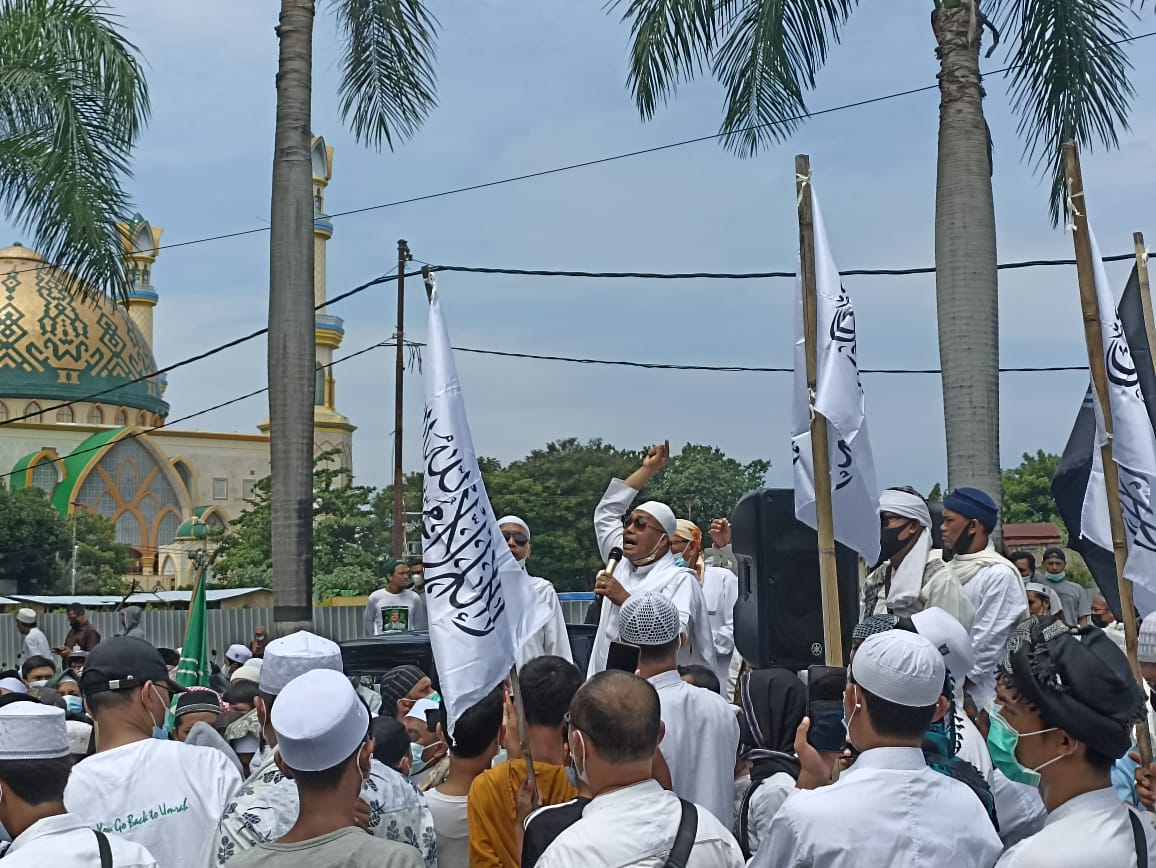 Sementara itu, Amrillah, sebagai perwakilan massa aksi, membacakan tuntutan massa aksi. Diantaranya, memprotes keras pernyataan Menag RI Yaqut Cholil Qoumas atas pernyataannya membandingkan suara adzan dan toa dengan gonggongan anjing.