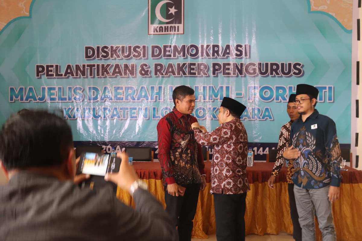 Penyematan bros apresiasi MD KAHMI KLU dari Ketua MD KAHMI KLU Dr. H. Najmul Akhyar, SH, MH kepada Ketua DPRD KLU,Artadi, S.Sos,. (foto: sbn/mdkahmiklu)